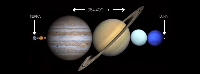 La Luna lleva un 27% del tamaño de la tierra y se ubica a 384.400 kilómetros de la tierra. Principalmente en el apogeo lunar donde la luna parece estar más cerca, tendemos a pensar que está realmente cerca, pero caben todos los planetas del sistema solar en fila entre la Tierra y la Luna.