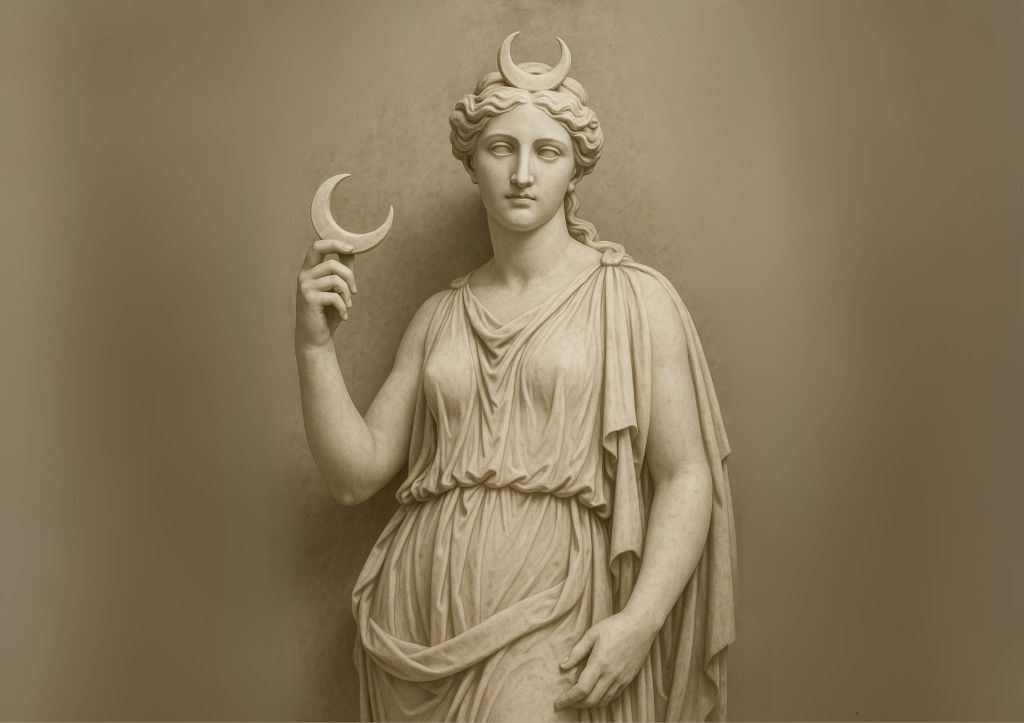 En la mitología griega, Selene (Σελήνη) es la diosa y personificación de la Luna, perteneciente a la segunda generación de titanes. Su nombre se asocia a selas, que significa “luz”, reflejando su naturaleza radiante en el cielo nocturno.